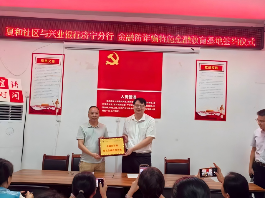 签约仪式在夏和社区党群服务中心举行,兴业银行济宁分行与石桥镇夏和社区共同签约建立“金融防诈骗特色金融教育基地”。双方签署了《“金融防诈骗特色教育基地”共建协议》,明确将以基地为载体,整合资源、创新形式,为社区居民提供精准化、场景化的金融反诈教育服务。