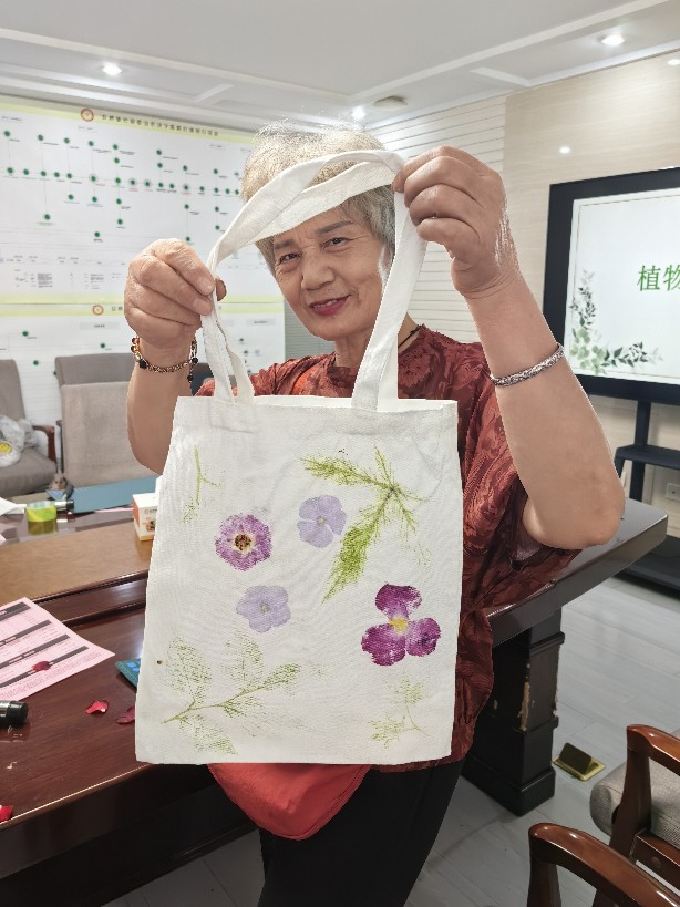 活动当天,支行现场布置得温馨雅致,充满了自然清新的气息。在活动主持人的指导下,客户们兴致盎然地挑选各自心仪的植物叶片与花瓣,通过细心摆放、轻轻敲拓,将植物的天然形态与色彩永恒定格在帆布包上。一时间,敲拓声、欢笑声交织在一起,现场气氛热烈而愉悦。每一位客户都全神贯注于创作过程,看着一件件独一无二、充满个人巧思的拓印作品在自己手中诞生,脸上无不洋溢着成就感和满足的笑容。
